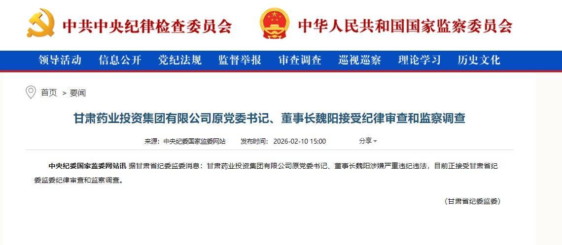 甘肃药业投资集团有限公司原党委书记、董事长魏阳涉嫌严重违纪违法,目前正接受甘肃省纪委监委纪律审查和监察调查。